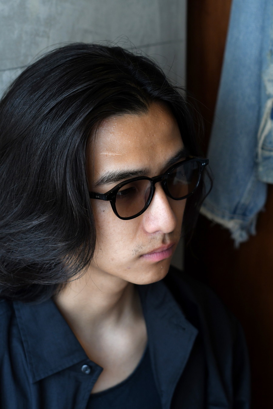 細身のフレームに生地を張り合わせ、ボストンとウェリントンを掛け合わせたモデル。