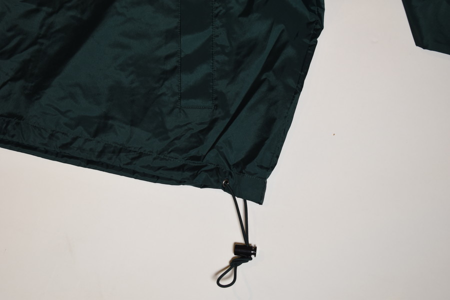 裾のドローコードで着丈の調節可能、ツバ付きのフード等